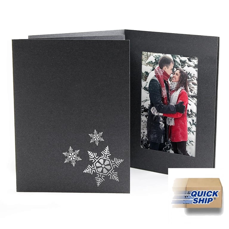 Our photo folder in black, accented with festive snowflakes in silver foil. The design is hot stamped (imprinted) onto the front of the folder as shown. Great for any type of Winter event or even as holiday greeting cards.