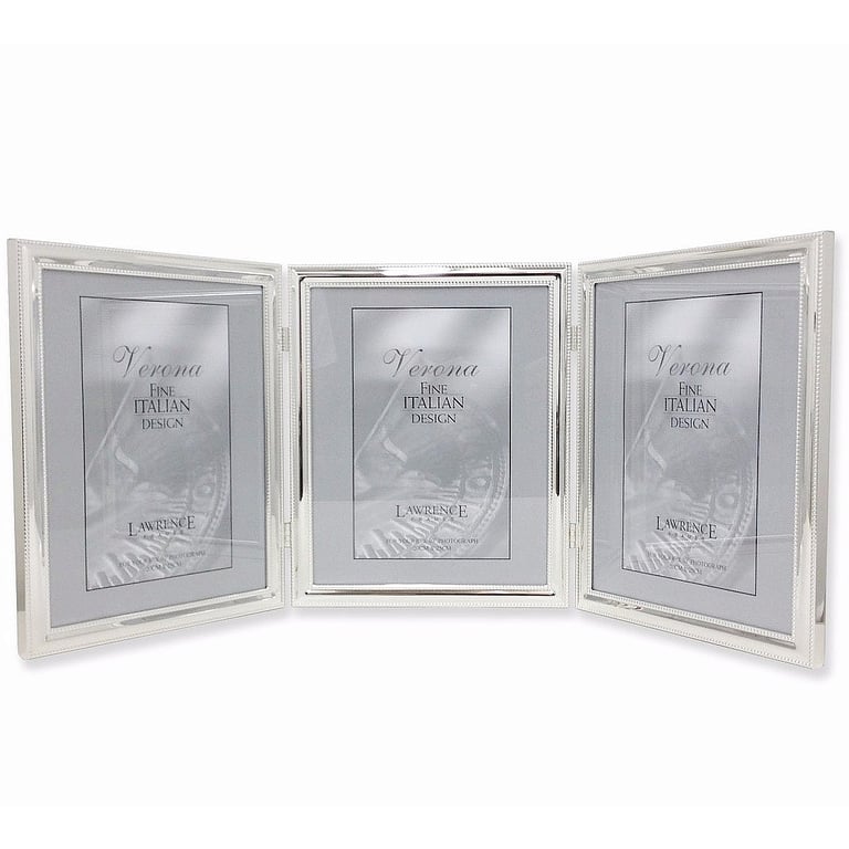 Main view Product Details Lawrence Frames® Polished silver hinged TRIPLE 8x10 bead trim — Hinged silver plate frame, beautifully crafted with invisible seams and corners.Double caviar bead trim border finishes the piece with excellent detail. Attractively backed with high quality navy velvet for wonderful desk appeal.Glare resistant glass lenses. Brass hinges for smooth closing.Proudly made by Lawrence Frames®, renowned for crafting fine frames for generations.. Polished silver hinged TRIPLE 8x10 bead trim Model #751148065238 List $110.00 You pay $89.95 In stock Ships next business day [?] Your Price Match is Active Your request for a price of $0.00 for a minimum quantity of has been accepted. You have [time] left to purchase this item for $0.00 instead of $89.95 each. Find a Lower Price? We BEAT All Authorized Retailers [?] FEATURESDisplays:8"x10"Material:SilverplateFinish:SilverOccasion:Anniversary, Birthday, Good luck, Graduation, Mother`s Day, Retirement, Romantic, Thank-Motivate-Reward, Celebrating Travels, WeddingStyle:Antique, Classic, Traditional, RomanticOrientation:Vertical OnlyBrand:Lawrence Frames®Display Type:Tabletop (or wall w/optional hanger - available separately) This item ships in its own box SHARE THIS ITEM Share on Facebook
