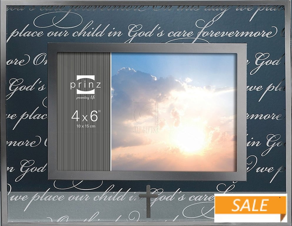 Product Details Prinz® frames & albums SACRED MOMENT CROSS ICON 6x4 frame by Prinz® — Celebrate your child with our 6" x 4" picture frame. The front of this frame reads: place our child in God's care forevermore Features: metal border and double-pane glass frame - see through one-way easel Produced by Prinz®, maker of fine albums for generations. SACRED MOMENT CROSS ICON 6x4 frame by Prinz® Model #086981756365 List $16.50 You pay $6.90 In stock Can be shipped today [?] Your Price Match is Active Your request for a price of $0.00 for a minimum quantity of has been accepted. You have [time] left to purchase this item for $0.00 instead of $6.90 each. Find a Lower Price? We BEAT All Authorized Retailers [?] FEATURESDisplays:6"x4"Material:GlassFinish:SilverOccasion:Baby shower, Baptism + Christening, Communion, Inspirational, New babyStyle:Contemporary, Sophisticated, Words & whimsy, Sentiments | ready made, Christian DevotionalsOrientation:Horizontal OnlyBrand:Prinz® frames & albumsDisplay Type:Tabletop (or wall w/optional hanger - available separately) This item ships in its own box SHARE THIS ITEM Share on Facebook