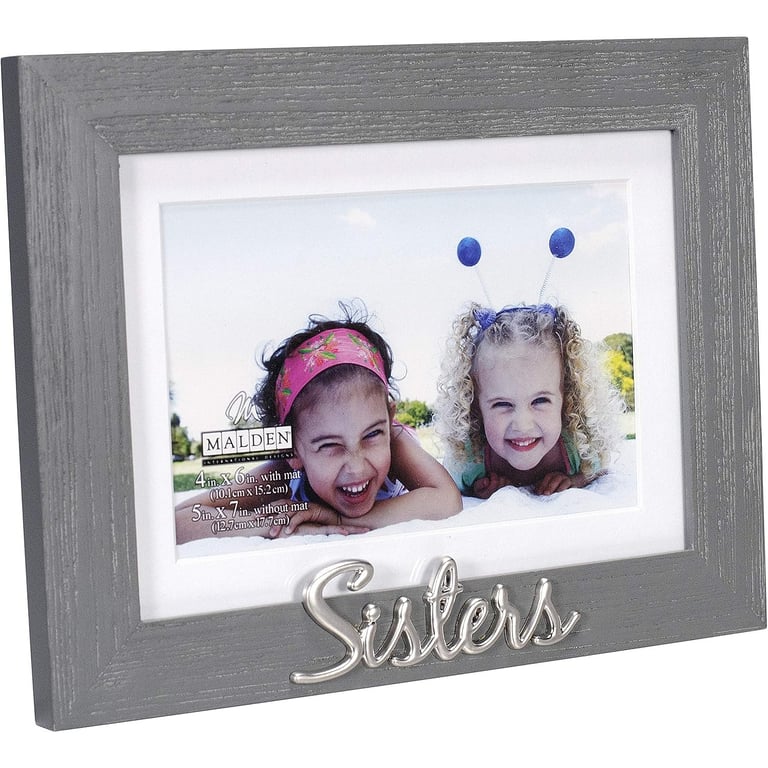 Main view Product Details Malden Designs® SISTERS 5x7/4x6 Matted Frame Captures a special moment together — Celebrate SISTERS with this special frame created just for them!Add a special snapshot and you've made a great gift that will always be appreciated.The text is satin silver mounted onto the distressed charcoal moulding. White mat enhances your 4x6 print. Or remove the mat and you can display a 5x7 print. Glare resistant glass lens. Hardboard easel back for tabletop display. Wall hooks included for easy hanging.This novelty frame is produced by Malden USA®. SISTERS 5x7/4x6 Matted Frame Captures a special moment together Malden Designs® FALL CELEBRATION Savings - ends SundayBuy More / Save More * Add this item to your cart for the full details of this promotion. Conditions may apply. Model #87148672 List $19.00 You pay $13.95 In stock Ships next business day [?] Your Price Match is Active Your request for a price of $0.00 for a minimum quantity of has been accepted. You have [time] left to purchase this item for $0.00 instead of $13.95 each. Find a Lower Price? We BEAT All Authorized Retailers [?] FEATURESDisplays:4"x6"Material:Wood (mdf/engineered)Finish:Gray/Charcoal, SilverOccasion:FriendshipStyle:Contemporary, Teens & tweens, Words & whimsy, Expressions > ready madeOrientation:Horizontal OnlyBrand:Malden Designs®Display Type:Desktop or Wall Approx. Overall Dimensions:9 1/8"x7"x1" This item ships in its own box SHARE THIS ITEM Share on Facebook