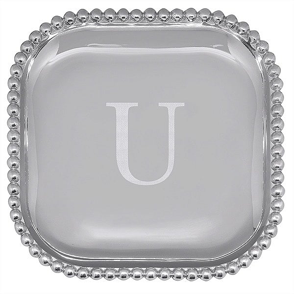 Product Details Mariposa® The original PEARLED 10in SQUARE PLATTER Engraved -U- by Mariposa® — The "U" Engraved PEARLED PLATTER designed by Michael Updike and hand-crafted by Mariposa. People love the Mariposa casual, sculpted elegance paired with their strong, virtually carefree material. Their artisan handcrafted look in recycled aluminum is both pleasing to the eye and touch, as well as 100% ecologically sound. Important Note: Mariposa items are hand engraved. Your piece may differ slightly from the photo. To see all monograms of this platter, click : "Pearled 10in platters - all letters" SendAFrame stocks the entire Mariposa® picture frame line - and related Brand and Design styled items like this Monogram engraved platter. To start - or add to your collection, click: Mariposa® Design Collection Product Care: Mariposa metals are handcrafted from 100% recycled aluminum Buffed until brilliant All items are food-safe and will not tarnish Handwash in warm water with mild soap and towel dry immediately Do not place in dishwasher or microwave Avoid extended contact with water, salty or acidic foods; coat lightly with vegetable oil or spray to avoid staining Warm to 350 degrees for hot foods. Freeze or chill for summer entertaining Cutting directly on the metal surface will scratch the finish Occasional use of non-abrasive metal polish will revive luster Leaving other metals on metal surfaces may cause discoloration The original PEARLED 10in SQUARE PLATTER Engraved -U- by Mariposa® Mariposa® FALL CELEBRATION Savings - Buy More / Save More * Add this item to your cart for the full details of this promotion. Conditions may apply. Model #808813158969 $120.00 This item is currently out of stock and we do not have an expected date at the present time. click here to be automatically notified when it comes back in stock or email merchandising@sendaframe.com for availability information. You can place this item in your shopping cart. It will be added to the 'saved for later' section. Your Price Match is Active Your request for a price of $0.00 for a minimum quantity of has been accepted. You have [time] left to purchase this item for $0.00 instead of $120.00 each. Find a Lower Price? We BEAT All Authorized Retailers [?] Approx. Overall Dimensions:10 1/2"x10 1/2" This item ships in its own box SHARE THIS ITEM Share on Facebook