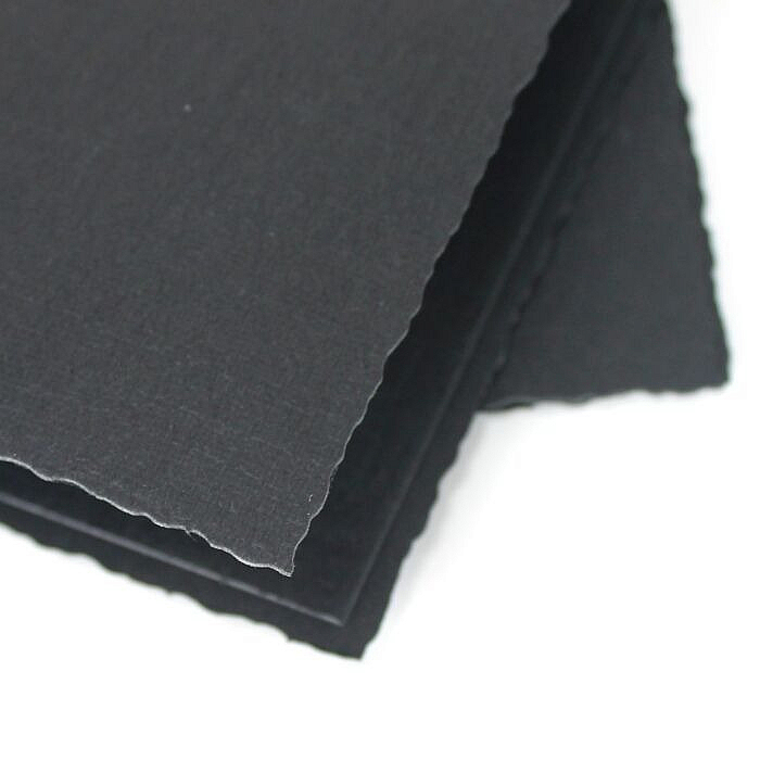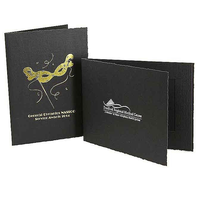 Terrific look and feel with linen weave finish, deckled edges, and black foil window border.